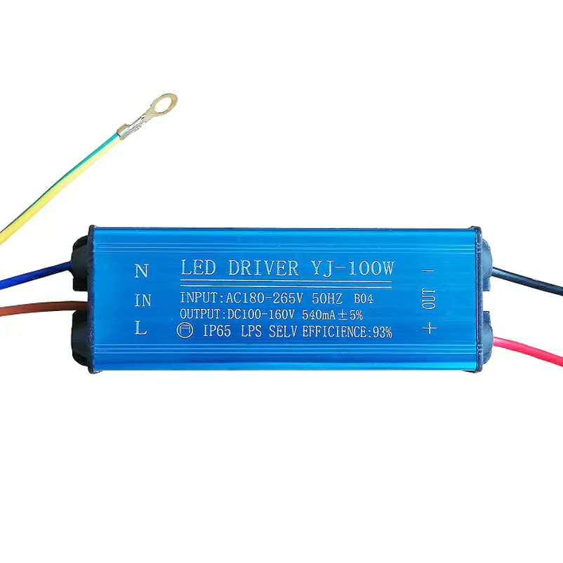 Світлодіодний LED драйвер 100 ватів 100-160V 550ma IP65 є джерелом постійного стабілізованого струму, який виготовлений як друкована плата з елементами в герметичному алюмінієвому корпусі (склепіння захисту IP67). З корпусу драйвера виведено по парі дротів з двох боків. Ізольовані дроти червоного та синього кольору, призначені для подавання вхідної напруги AC180-265 В (полярність не важлива), ізольовані дроти червоного та чорного кольору — це вихід для під'єднання світлодіода: чорний дріт "+", червоний дріт "-".